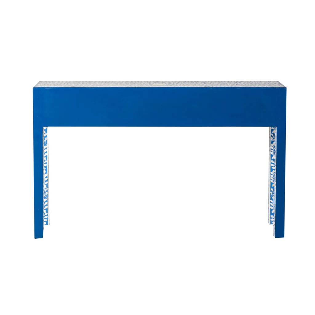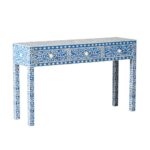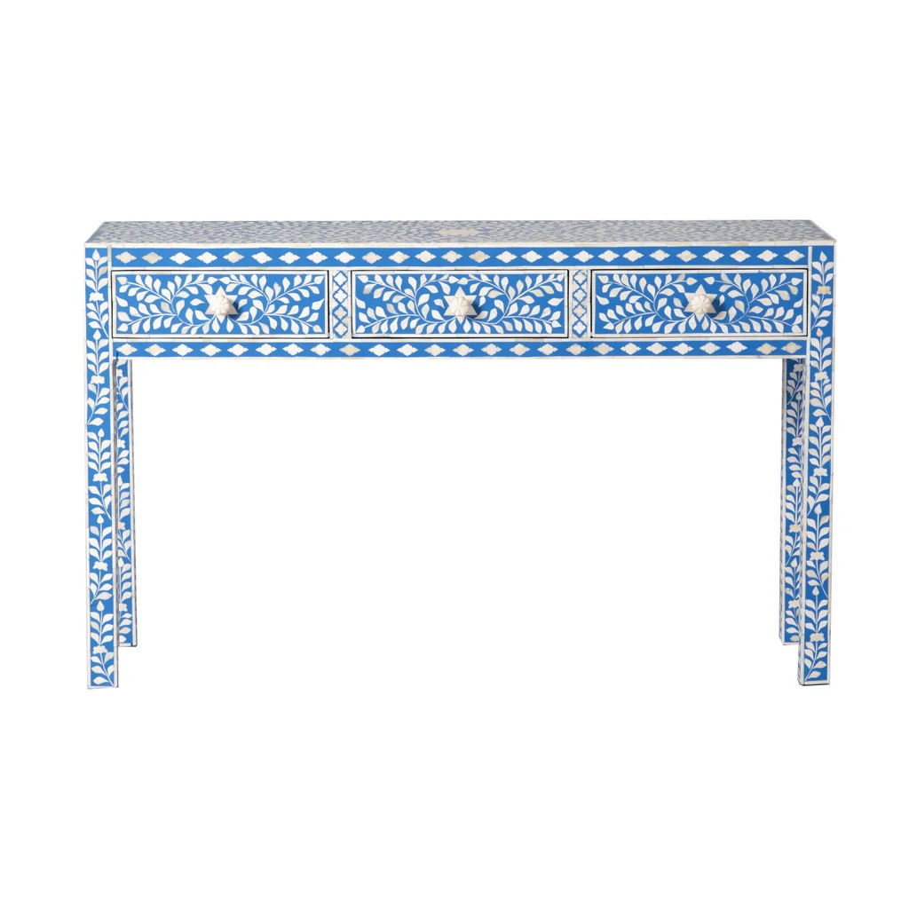 Add timeless elegance to your home with our Bone Inlay Three Drawer Console Table. Meticulously crafted by skilled artisans, this piece features intricate bone inlay patterns set against a smooth resin background, creating a stunning visual appeal.