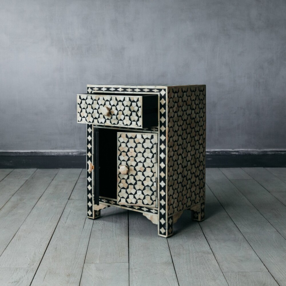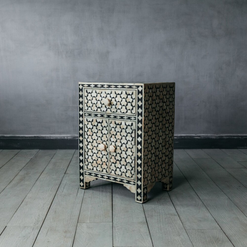 Home Shop BEDROOM Bedside Table / Nightstands Handmade Bone Inlay Modern Bedside Cabinet l Bone Inlay Night Stand